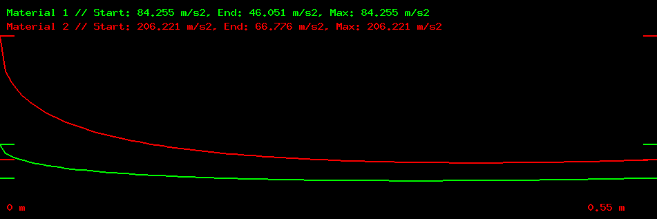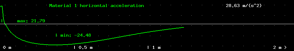 частицы 1-го материала (по вертикали, м/с2); на графике автоматически проставляются метки в точках, где горизонтальная проекция ускорения частицы минимальна и максимальна,