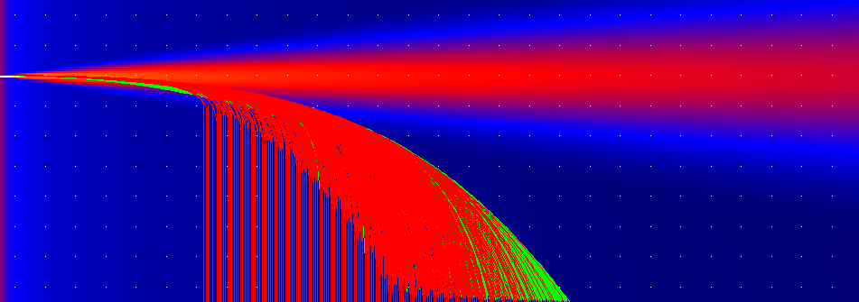 Синими вертикальными полосами обозначены границы между приемными контейнерами, установлеными по длине на разных расстояниях по горизонтали от точки выхода смеси из разгонного канала. Числами