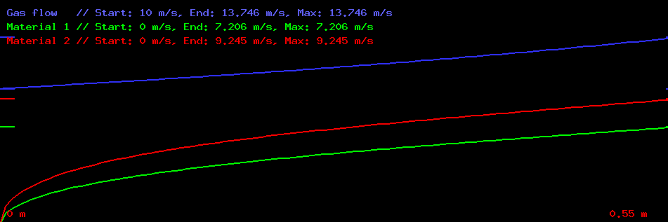 частицы 1-го материала (по вертикали, м/с); на графике автоматически проставляются метки в точках, где горизонтальная проекция скорости частицы минимальна и максимальна, а также указываются